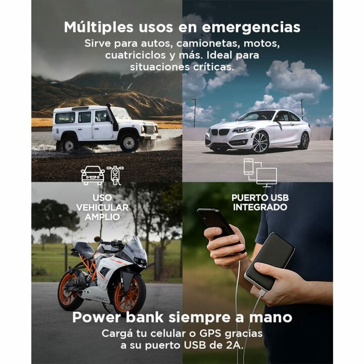 Presentamos el Power Bank Jump Starter, una herramienta versátil y poderosa diseñada para brindarte la seguridad y la confiabilidad que necesitas en la carretera. Este dispositivo no solo te permite cargar tus dispositivos electrónicos en cualquier lugar, sino que también es capaz de arrancar tu aut...