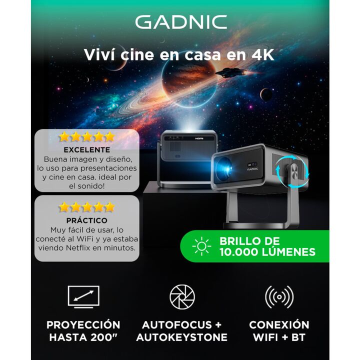Imagen 4k nativa hasta 200 pulgadas: El Proyector Gadnic C30B ofrece resolución nativa 4k, ideal para disfrutar películas, series y presentaciones con buena definición. Su rango de tamaño proyectado de 35 a 200 pulgadas permite crear desde un cine en dormitorio hasta una pantalla grande en el living...