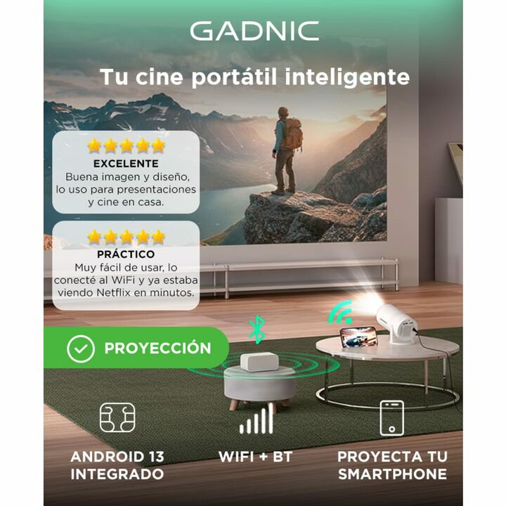 Tecnología smart con Android 13: Su sistema operativo Android 13 transforma el proyector en un verdadero Smart TV. Instalá tus aplicaciones favoritas, navegá por la interfaz fluida y personalizá tu contenido con total libertad. Todo desde el control remoto incluido, sin necesidad de notebook o celul...