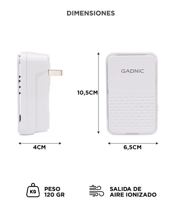 Purificación activa con tecnología de iones negativos El Purificador de Aire Gadnic libera hasta 120 millones de iones negativos por centímetro cúbico. Esta tecnología ayuda a neutralizar partículas suspendidas como polvo, humo y olores, contribuyendo a mejorar la calidad del aire en ambientes cerra...