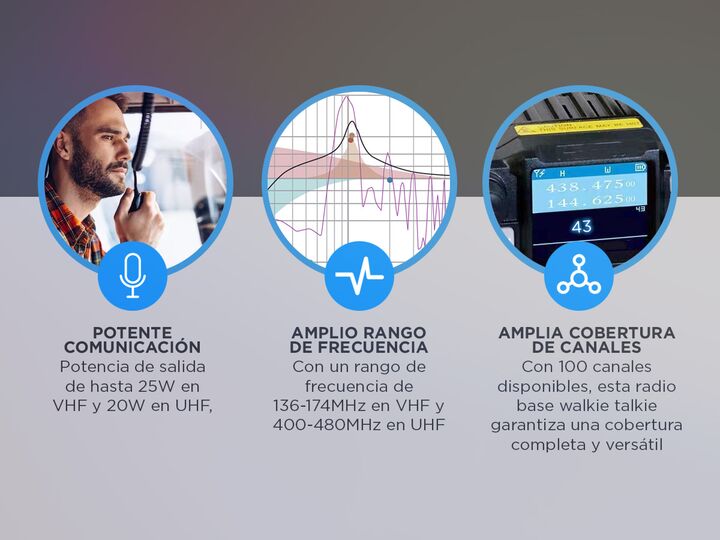 Experimenta la comunicación sin límites con nuestra Radio Base Walkie Talkie. Con una potencia de salida de hasta 25W en VHF y 20W en UHF, esta radio asegura una cobertura amplia y clara, adaptándose a una variedad de entornos y necesidades de comunicación. Equipada con funciones avanzadas, como com...