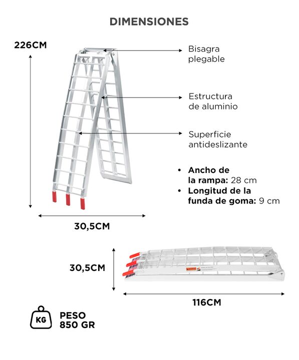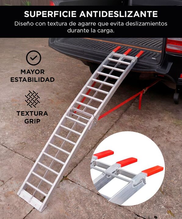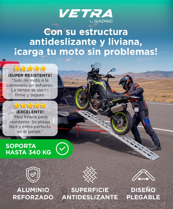 Carga segura para motos y vehículos recreativos La rampa para motos Vetra by Gadnic permite subir motocicletas, ATV o equipos pesados a camionetas y trailers con mayor estabilidad. Su estructura está diseñada para soportar cargas exigentes en tareas recreativas o de trabajo. Alta resistencia con est...