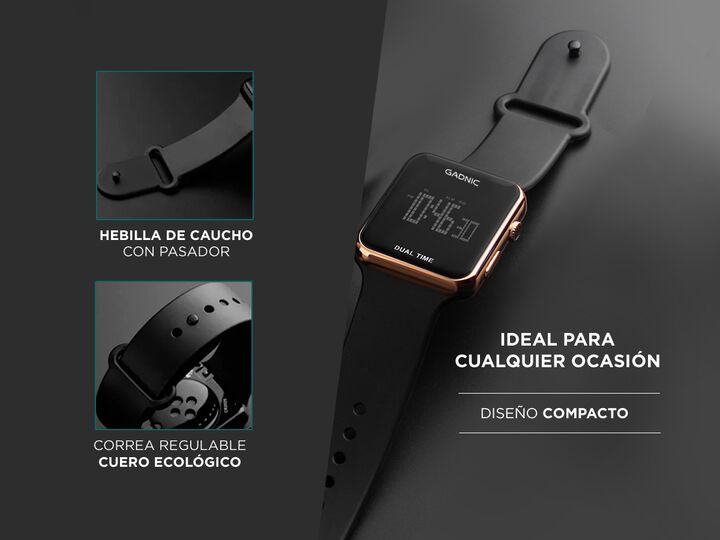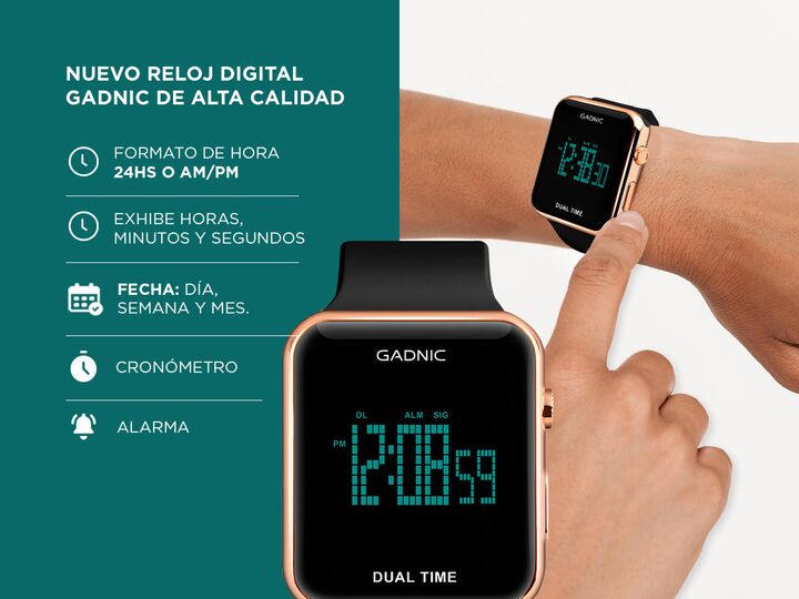 Lectura clara y funciones esenciales El reloj digital Gadnic RM90F24 ofrece una visualizacion clara de la hora minutos y segundos en pantalla digital. Permite elegir entre formato 24 horas o AM PM segun preferencia. Tambien muestra la fecha completa con dia mes y semana. Es practico para el uso diar...