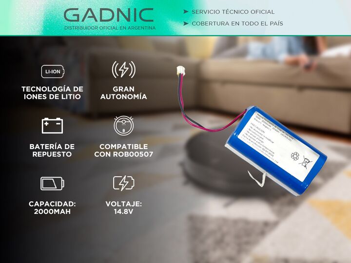 Esta batería de repuesto compatible con la aspiradora robot Gadnic ROB00507 te garantiza un rendimiento óptimo y duradero. Con tecnología de iones de litio, 2000mAh de capacidad y 14.8V, es recargable y ofrece una excelente autonomía para largas sesiones de limpieza. Ideal para mantener tu aspirador...