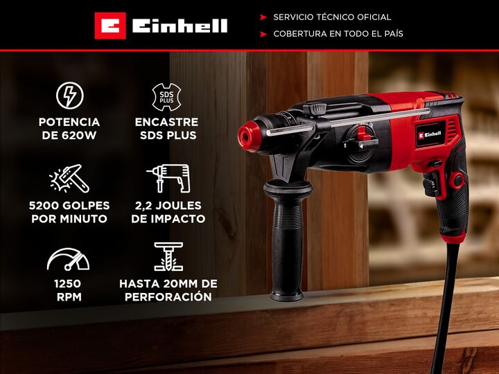 Acerca de Rotomartillo Taladro Rotopercutor Einhell SDS Plus 2.2J TC-RH 620 4F Los taladros de impacto TC-RH 620 4F se utilizan siempre que las cosas se ponen difíciles: para materiales duros como piedra y hormigón. El taladro de impacto es el modelo de nivel de entrada perfecto y combina rendimient...