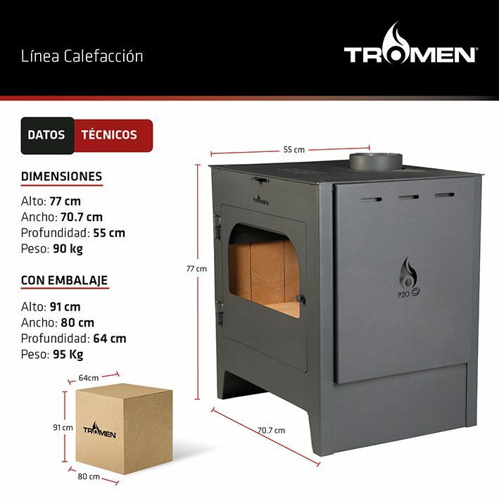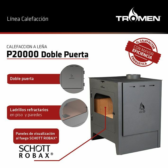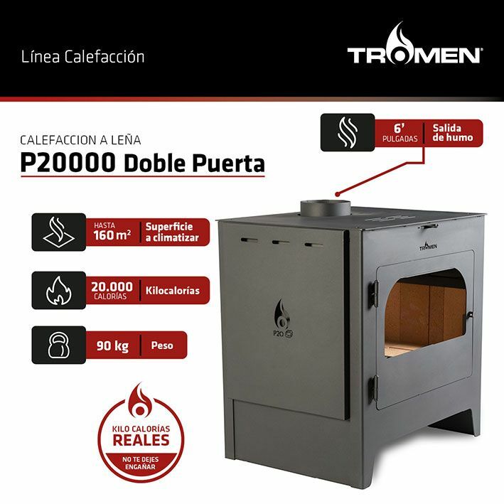 CARACTERISTICAS destacadasPotencia trmica 20.000 KcalhCalefacciona hasta 160 mDoble puerta frontalSalida de humo 6Leos de hasta 25 cmPiso y laterales con material refractarioCajn recolector de cenizas externoRegulador de temperaturaMedidasAncho 707 cmAlto 77 cmProfundidad 55 cmPeso 115 kgKit de Ins...