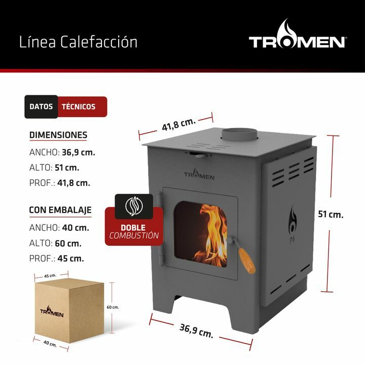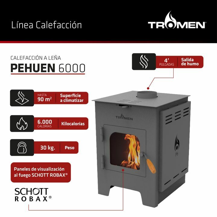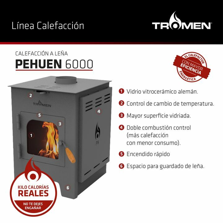 La solidez de la lnea Pehuen en un calefactor compactoPotencia 6.000 kcalhoraAmbiente a Climatizar 65 m2DimensionesAncho 36.9 cmAlto 51 cmProfundidad 41.8 cmPeso 30 kgVisor de vidrioabertura con manijaLadrillos refractarios en piso y lateralesEntrada de aire regulablesalida de humo 4Los Kit de Insta...