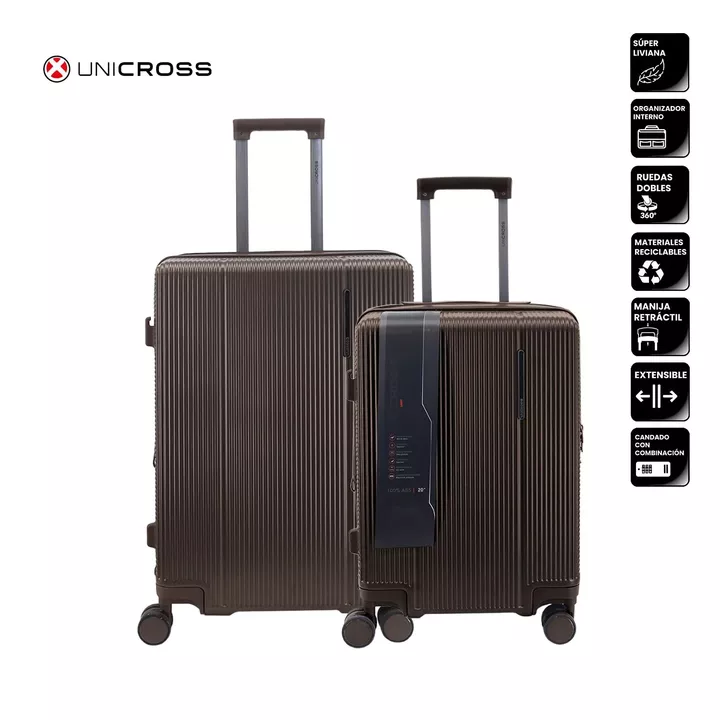 Viaj con comodidad seguridad y estilo con el set de valijas Unicross diseado para acompaarte en cualquier destino. Fabricadas con materiales resistentes y reciclables combinan durabilidad liviandad y un diseo moderno con textura rgida anti-rayas.CaractersticasSper livianas.4 ruedas dobles con giro 3...