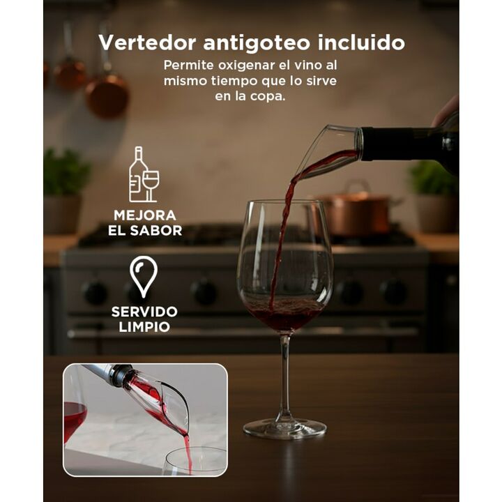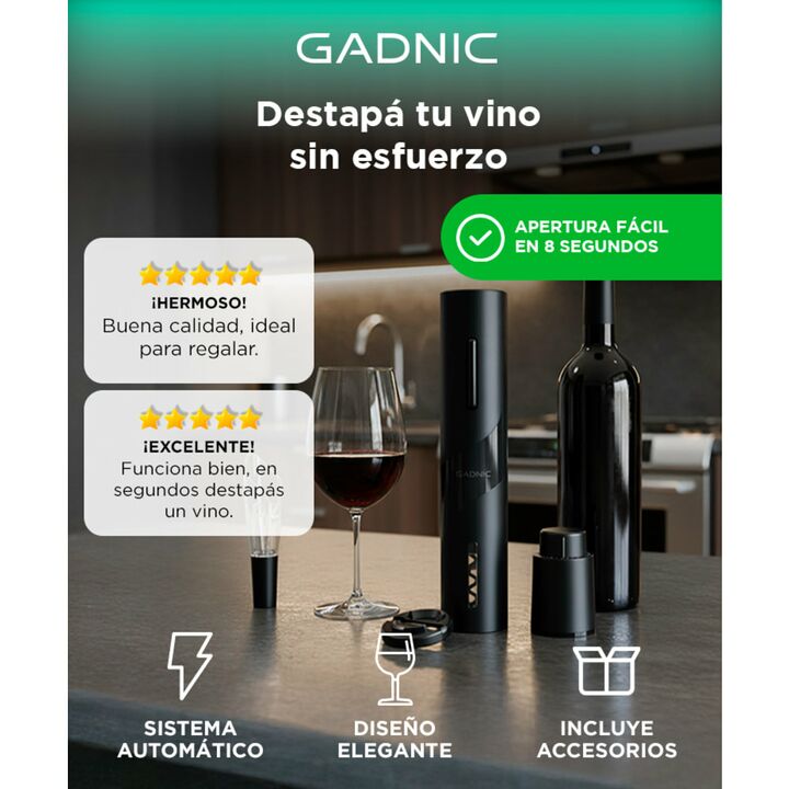 ¡Nuevo Set de Vino Gadnic! Este Set funciona con cualquier botella de vino y es ideal para regalar en ocasiones especiales a aquellos amantes del vino. La forma más fácil de enriquecer el aroma, suavizar los taninos y mejorar el sabor del vino. El aireador Gadnic permite oxigenar el vino al mismo ti...