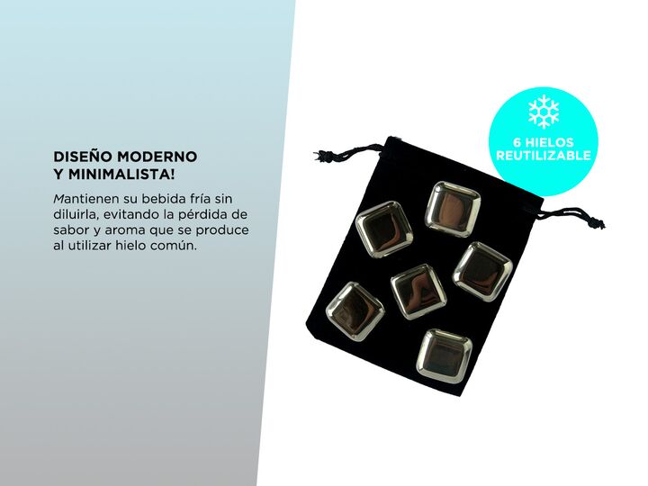 ¡Bienvenidos al mundo de la elegancia y la sofisticación en el consumo de bebidas! Les presentamos nuestro exclusivo set de cubos de hielo de acero inoxidable, el complemento perfecto para su whisky, vino u otras bebidas favoritas. Cada set incluye 6 cubos de hielo reutilizables, fabricados en acero...