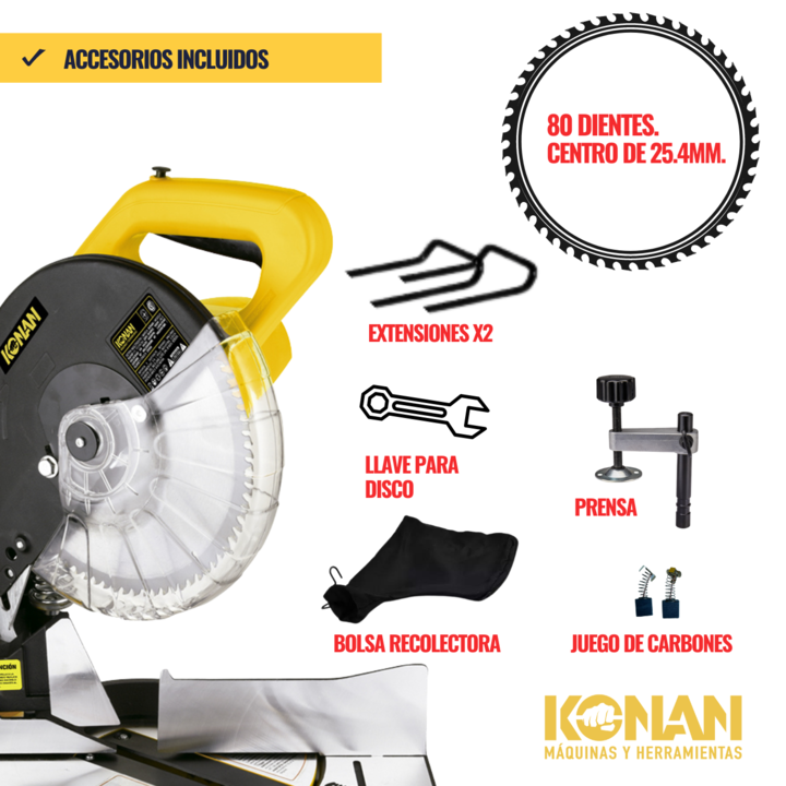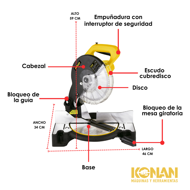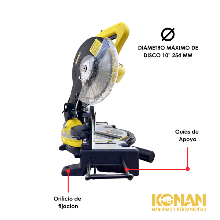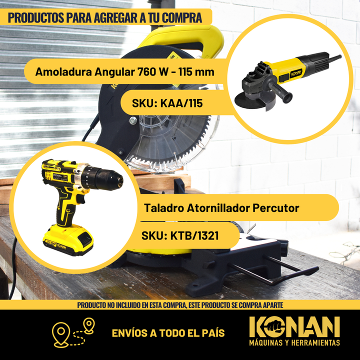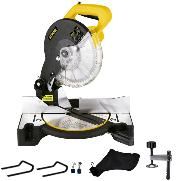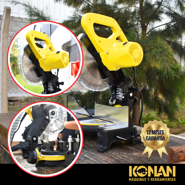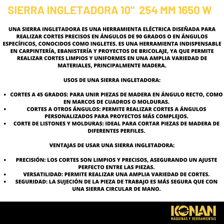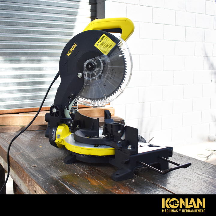La sierra ingletadora KONAN es una herramienta eléctrica diseñada para realizar cortes precisos en ángulos de 90 grados o en ángulos específicos, conocidos como ing...