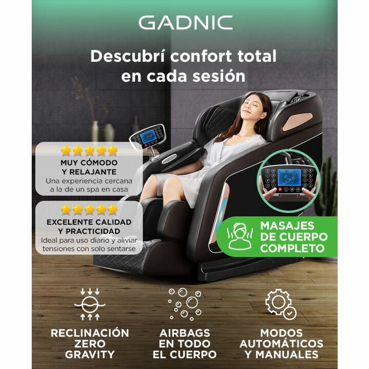 Acerca de Sillon Masajeador Gadnic Relax Gadnic presenta el nuevo Sillón Masajeador Relax el cual cuenta con certificaciones y homologaciones tanto a nivel local como internacional, con sistema de rodillos para todas partes de tu cuerpo. Podrás relajarte totalmente ya que llegará a partes como la co...