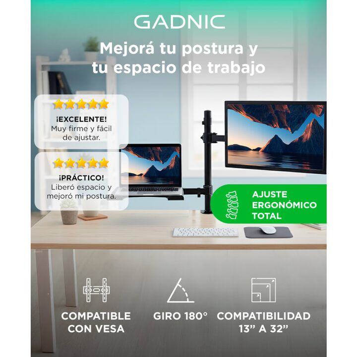 Presentamos el Soporte de Brazo Doble Gadnic, la solución definitiva para optimizar tu espacio de trabajo y mejorar la ergonomía. Este soporte versátil y robusto es compatible con monitores de 13 a 32 pulgadas, soportando un peso de 2 a 8 kg por brazo, lo que lo hace ideal para una amplia gama de pa...