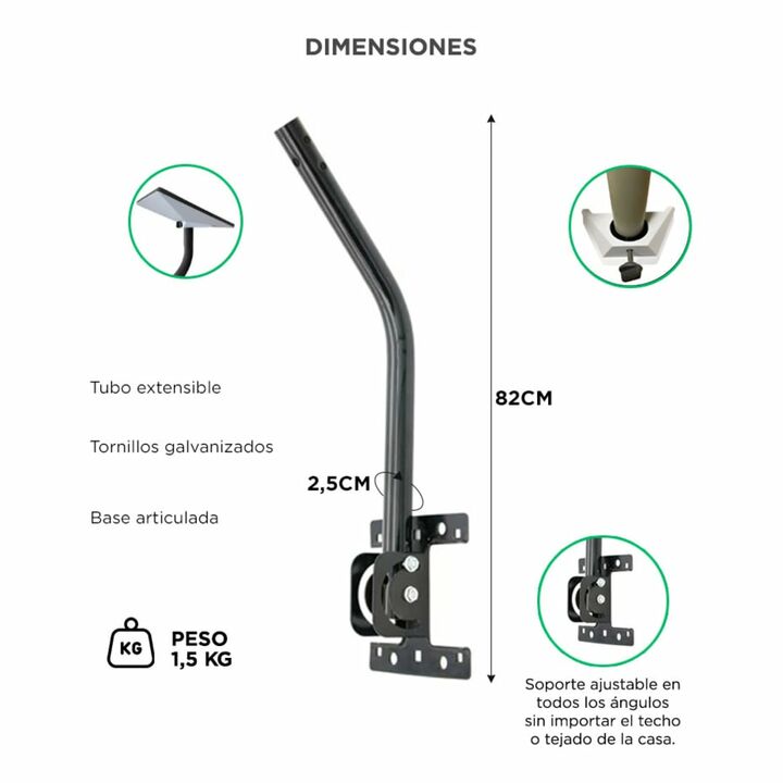 Instalación segura y estable Diseñado para ofrecer una instalación segura y estable, este soporte para antena combina resistencia y practicidad. Su caño metálico de 25mm brinda una estructura sólida y confiable para antenas exteriores de distintos tamaños. Con una altura total de 82cm y un diseño cu...