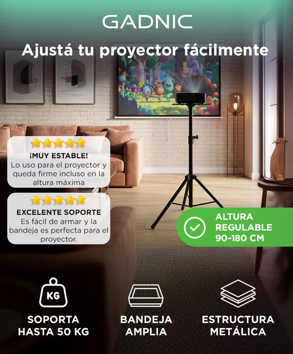 Altura regulable para ajustar la proyección fácilmente El Soporte para Proyector Gadnic permite ajustar la altura entre 90 y 180 cm, facilitando encontrar la posición ideal para proyectar en diferentes ambientes. Es una solución práctica tanto para cine en casa como para presentaciones. Base tipo tr...