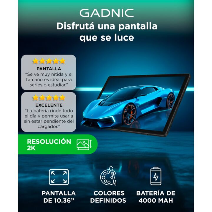 Pantalla 2K de 10.36” para una visualización cómoda y detallada: La Smart Tablet Gadnic 10.36” cuenta con pantalla Incell de 2000×1200 píxeles, que brinda imágenes nítidas y colores equilibrados. Mejora la experiencia al ver contenido multimedia, leer documentos o navegar durante períodos prolongado...