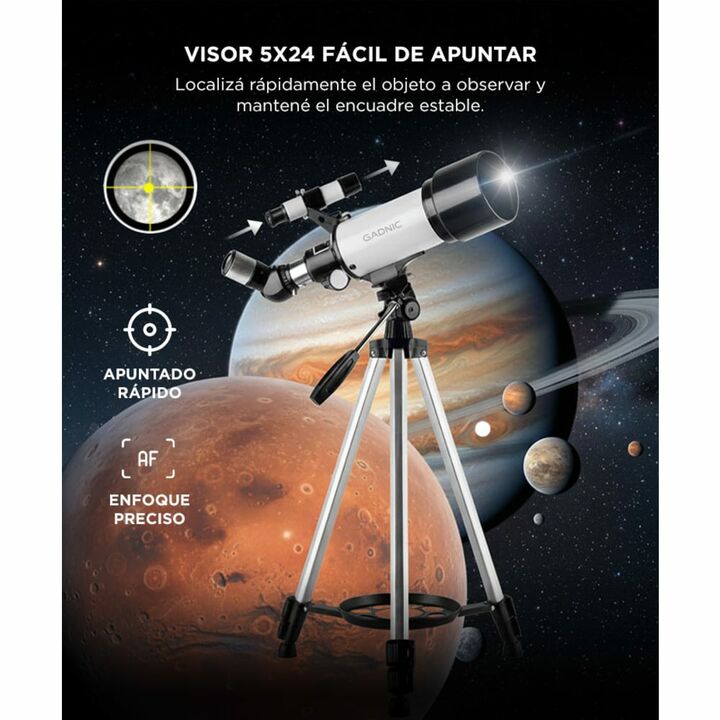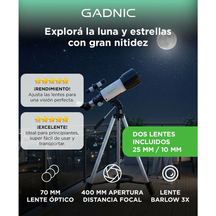 ¡Presentamos su nueva linea de Telescopio/Binocular Reflector Gadnic! El TE10 de Gadnic es muy adecuado para niños y principiantes como regalo de Navidad o regalo de cumpleaños. Observe el paisaje y los animales salvajes durante el día, y observe las estrellas y la luna por la noche. Este telescopio...