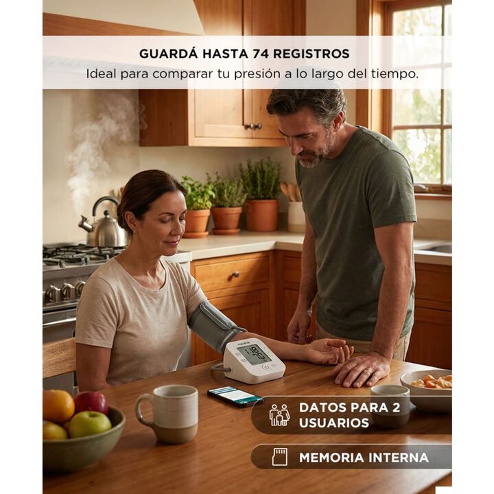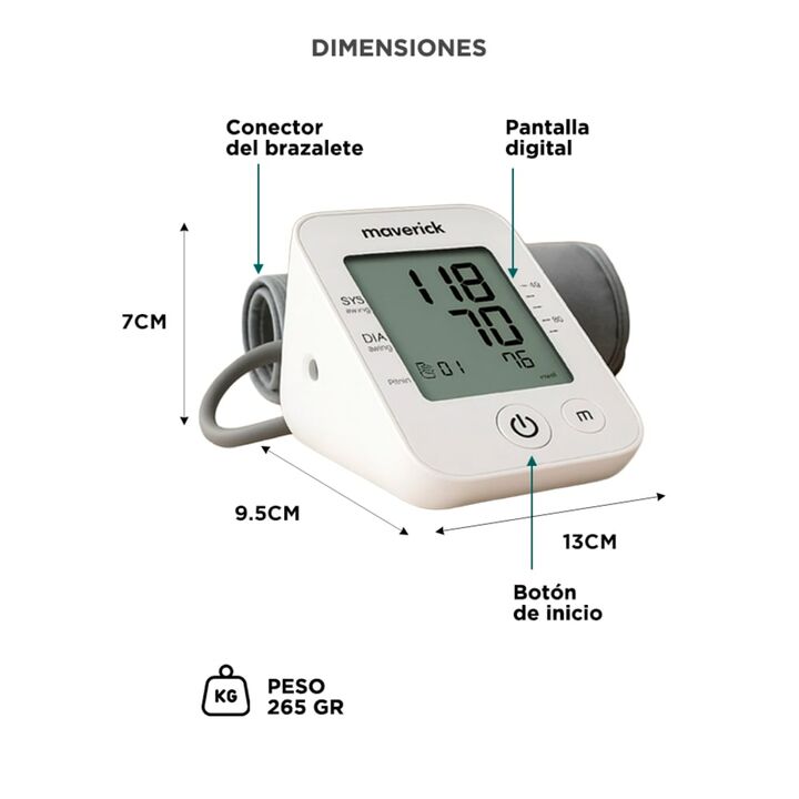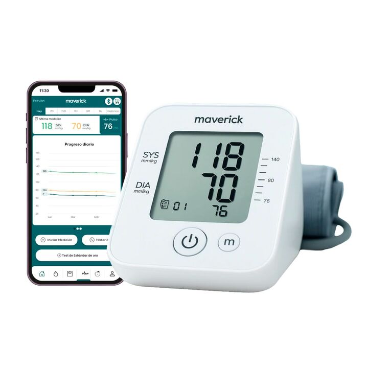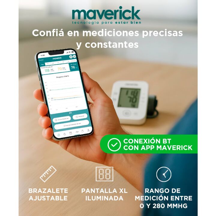 Medición automática precisa de presión arterial y frecuencia cardíaca con pantalla grande y clara. Onetouch para uso simple y conexión Bluetooth con app Maverick para registros. Almacena hasta 74 mediciones y genera tendencias para seguimiento de salud. Brazalete ajustable 22–45cm para comodidad y p...