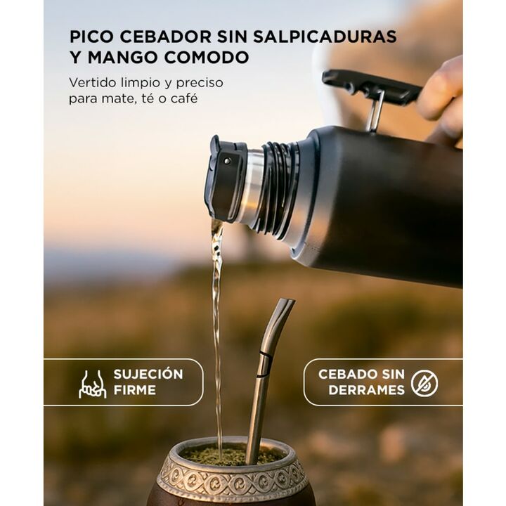 Diseño robusto y práctico para exteriores Ideal para camping, picnic o largas jornadas. Su mango firme facilita el agarre en cualquier situación. Capacidad ideal de 1.2 litros Cebá sin interrupciones gracias a su tamaño que rinde varias rondas de mate o bebidas calientes. Pico cebador antiderrame Ve...