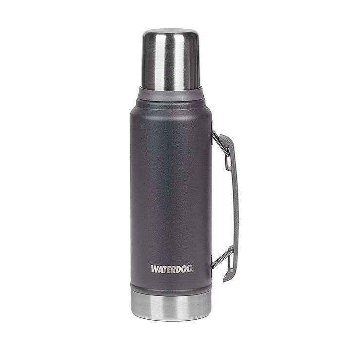 Termo de acero inoxidable de Acero AISI 304Capacidad 1000 ccCon manija de agarre y transporteDoble pared aislanteRecubrimiento powder Coated.Tapn cebador 360 interior de PP.