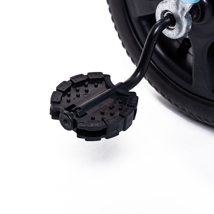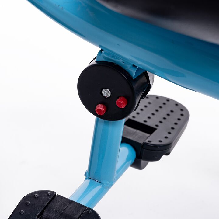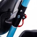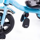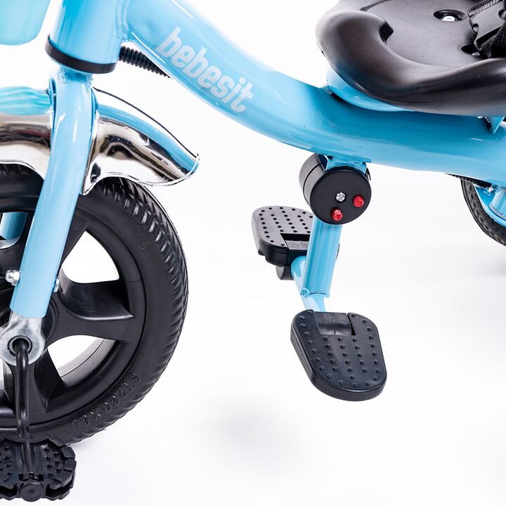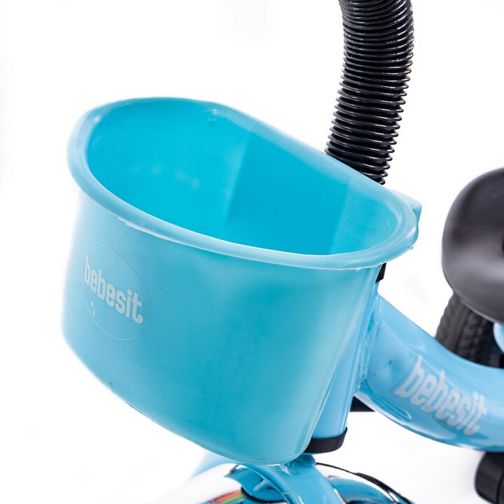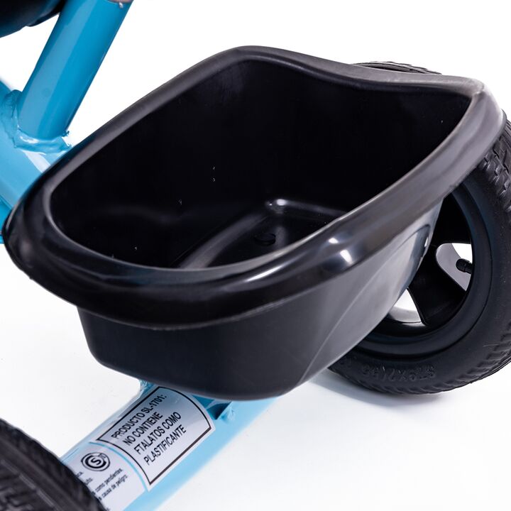 TRICICLO DE ACERO REFORZADO CON MANIJA DE EMPUJE. Cuadro de acero reforzado. Manija de empuje direccional extraíble. Canasto portaobjetos delantero y trasero. Posapiés rebatible. Cinturón de seguridad.
