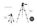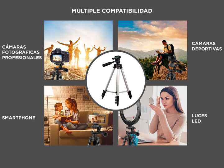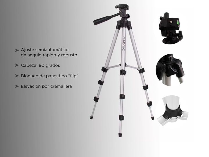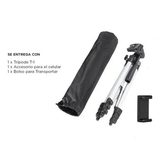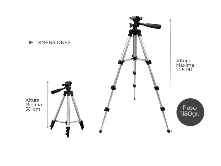 ¡Sacá las mejores fotos con nuestros trípodes! Con una altura máxima de 1.35 metros y una altura mínima de 50cm es ideal para sacar fotos y filmar lo que quieras. Su carga máxima es de 3 kg y posee un bloqueo de 3 patas de tipo “FLIP” para mayor estabilidad. Cuenta con mecanismo de elevación y un aj...