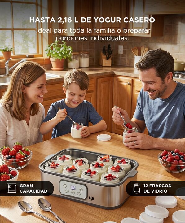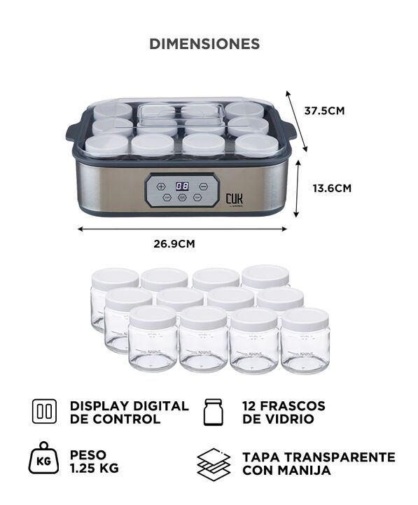 Control digital preciso de temperatura y tiempo Programá fácilmente tus recetas y obtené siempre el resultado perfecto, sin supervisión constante. Hasta 2,16L de yogur saludable casero Incluye 12 frascos de vidrio reutilizables para preparar porciones individuales sin conservantes. Probóticos activo...